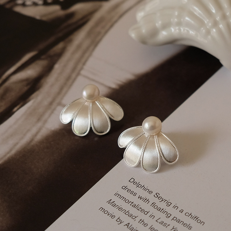 Flower Brushed Half Petal Pearl Stud Earrings For Women